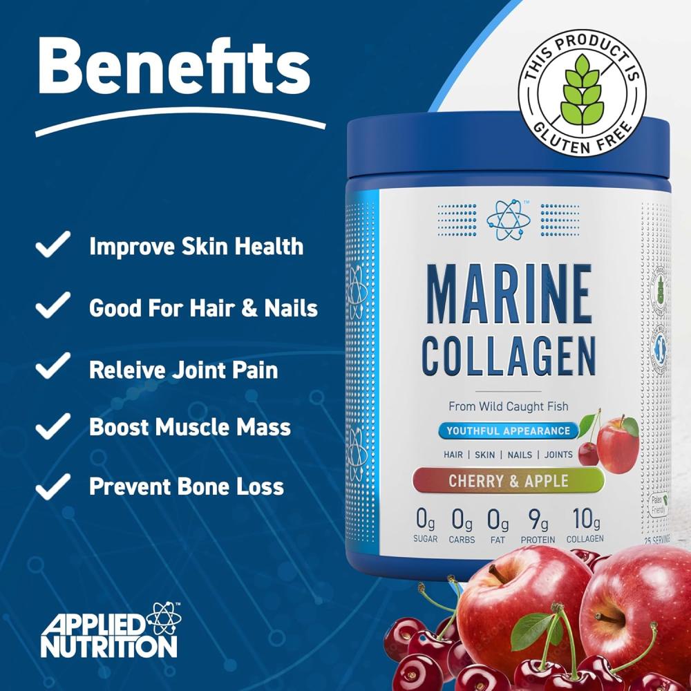 Applied Nutrition Marine Collagen is a marine-sourced collagen supplement designed to support healthy skin, hair, nails, and joints. Here are some key points about this product:
