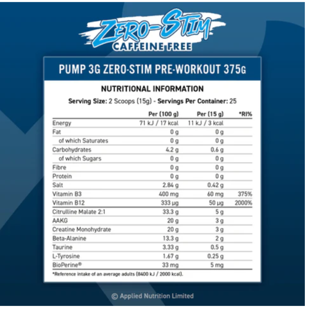 Applied Nutrition Pump 3g Zero Stimulant is a combination of the most popular and most researched ingredients to help improve pumping, focus and performance. Creatine Monohydrate increases high-impact physical performance for short-duration, high-intensity exercise without a strong stimulant dose. It contains vitamin B12 to reduce fatigue and exhaustion. It helps improve focus and performance. It is ideal for late-night workouts. Creatine monohydrate increases physical performance in successive bursts of short-term exercise.